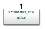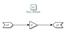 В этой таблице показан код C для функции, которая умножает входное значение на два, и блок функции Simulink, который может представлять эту функцию в модели Simulink.