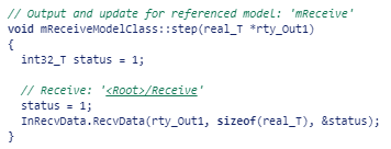 Чтобы просмотреть, как модель, на которую ссылается получение, вызывает функцию службы, откройте ее файл C++, mRecieve.cpp. В пошаговой функции модель вызывает сервисную функцию для получения сообщений и статуса от верхней модели.