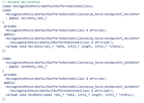 методы конструктора, ReceiveComponentRecvData(*this) и SendComponentSendData(*this)создайте объекты receive и send service соответственно, используя в качестве аргумента ссылку на экземпляр модели верхнего уровня. Каждый объект сервиса сохраняет ссылку на модель верхнего уровня и определяет интерфейс сообщений (сервисные функции RecvData и SendData).