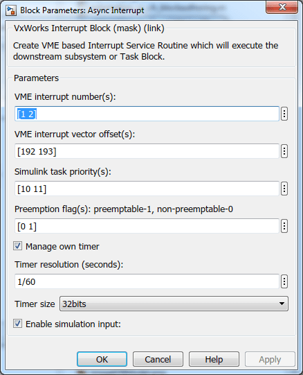 sysIntEnable(2);Аппаратное обеспечение, генерирующее прерывание, не настроено блоком асинхронного прерывания. Как правило, источником прерываний является плата ввода-вывода VME, которая генерирует прерывания для определенных событий (например, для окончания аналого-цифрового преобразования). Уровень и вектор прерывания VME устанавливаются в регистрах или с помощью перемычек на плате. Вы можете использовать mdlStart подпрограмма написанного пользователем драйвера устройства (S-функция) для настройки регистров и разрешения генерации прерываний на плате. Необходимо сопоставить уровень и вектор прерывания, указанные в диалоговом окне блока асинхронного прерывания, с уровнем и вектором, установленными на плате ввода-вывода.