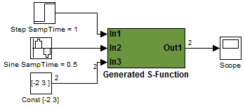 В этой модели SourceSubsys наследует время выборки и ширину сигнала из входных сигналов. Однако блоки S-Function, созданные из модели с использованием цели S-функции, имеют все атрибуты сигнала (такие как ширина сигнала или время выборки) с жесткой проводкой. (Единственное исключение из этого правила касается времени выборки, как описано в разделе Распространение времени выборки в сгенерированных S-функциях.)