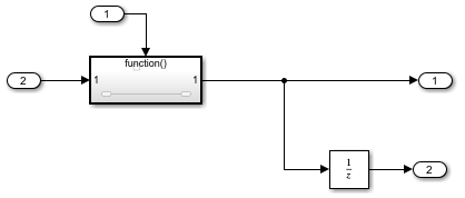 Подсистема функционального вызова подключается непосредственно к блоку Outport, а сигнальная линия, соединяющая подсистему с блоком Outport, ответвляется к блоку, имеющему Update функция (блок, который обновляется на каждом основном временном шаге, например, Unit Delay и Memory). Ветвь может находиться внутри или снаружи подсистемы. В модели, включающей подсистему вызова функций, необходимо вставить блок преобразования сигналов в одно из следующих расположений: