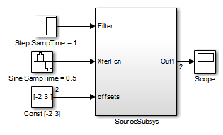 Установка ширины сигнала и времени выборки входов внутри SourceSubsys таким образом, чтобы они соответствовали сигналам в исходной модели. Ввод 1, Filter, имеет ширину 1 и время выборки 1. Ввод 2, Xferfcn, имеет ширину 1 и время выборки 0,5. Ввод 3, offsets, имеет ширину 2 и время выборки 0,5.