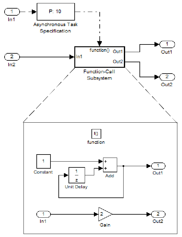 В этой модели подсистема вызова функций используется для отслеживания общего количества асинхронных событий и умножения набора входов на 2.