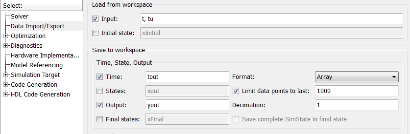 По умолчанию выбираются параметры Время (Time) и Выход (Output), а выходные переменные называются tout и yout.