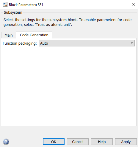 2. В диалоговом окне Параметры подсистемы (Subsystem Parameters), если подсистема является виртуальной, выберите Обработать как атомную единицу (Treat as atomic unit). Эта опция делает подсистему невиртуальной. На закладке Создание кода теперь доступна опция Упаковка функций.