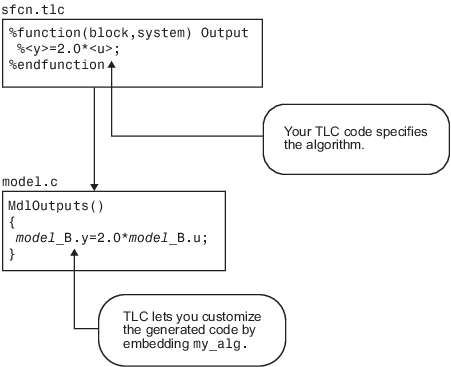 Во втором примере используется TLC-файл оболочки. Вместо генерации алгоритмического кода на месте в этом примере вызывается функция C, которая содержит тело кода. Существует несколько потенциальных преимуществ использования TLC-файла оболочки: