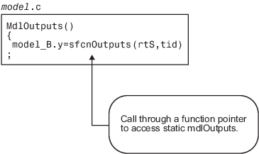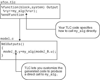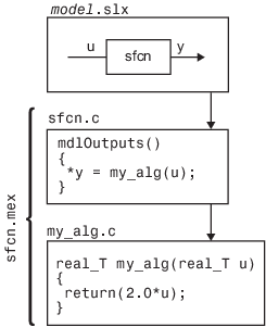 }Следующая диаграмма иллюстрирует встраивание S-функции в качестве обертки. Алгоритм вызывается непосредственно из сгенерированного кода модели, удаляя служебные данные S-функции, но поддерживая пользовательскую функцию.