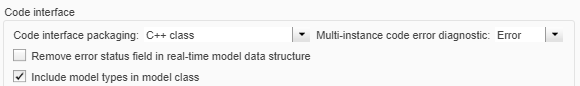 Поведение при генерации кода интерфейса - стиль аргументов ввода-вывода спецификации пошагового метода поддерживает односкоростные модели и многоскоростные модели с одной задачей. Многоскоростные многозадачные модели не поддерживаются. Кроме того, интерфейс инкапсуляции C++ не является интерфейсом по умолчанию, значение игнорируется для скалярных корневых входов с фиксированным размером Pass по значению параметра генерации кода.