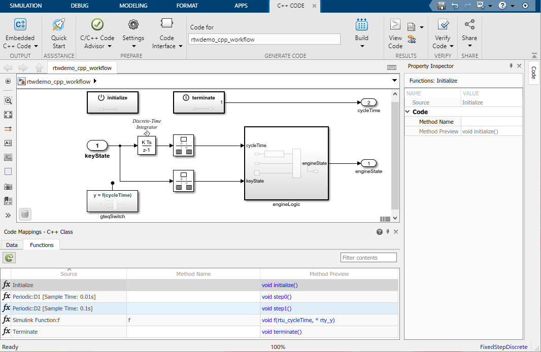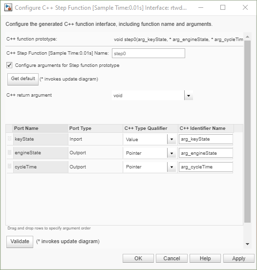 Настройте имена и аргументы методов классов. При создании кода C++ из модели функции модели отображаются в создаваемом коде как методы классов. Для интеграции с требованиями внешнего кода или интерфейса можно настроить имя созданных методов класса. Кроме того, для базовых периодических функций и Simulink Functions можно настроить имя, порядок и идентификатор создаваемых аргументов.