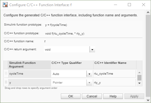 Чтобы проверить изменения аргументов функции Simulink, просмотрите поле Прототип функции Simulink, чтобы просмотреть ожидаемый прототип метода.