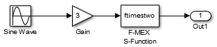 В MATLAB измените папку (cd) во временную папку и создать модель Simulink с S-функциональным блоком, вызывающим timestwo.