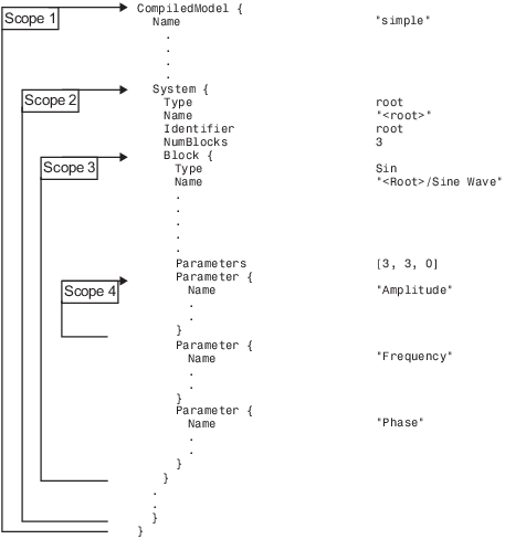 Следующий код показывает более подробный пример области, где Block запись имеет несколько пар параметр-значение (Type, Name, Identifierи так далее), и три субзаписи, каждая из которых называется Parameter. Block является субзаписью System, которая является субзаписью CompiledModel. Обратите внимание, что имена параметров в этом файле изменяются с версии на версию.