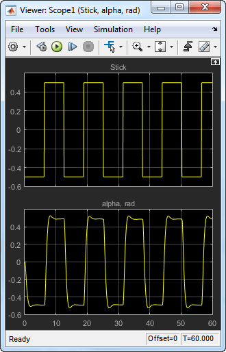 Убедитесь, что alpha, rad регистрировался путем расчета времени моделирования по сравнению с этой переменной. В окне команд введите: