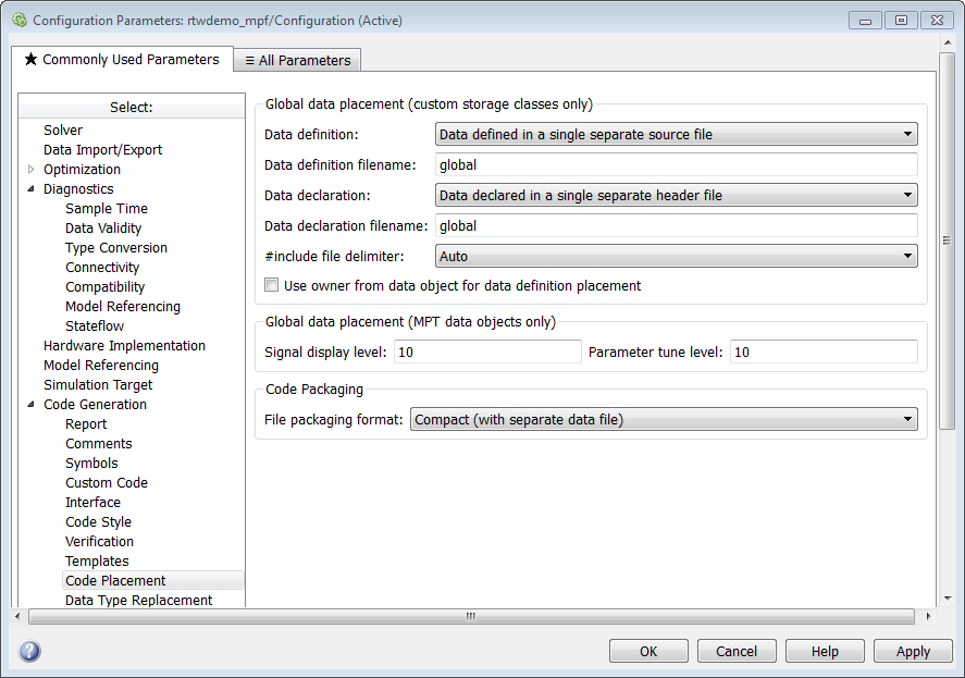 Следует отметить, что на начальных этапах разработки отладку может волновать больше, чем размер кода. Кроме того, может потребоваться, чтобы в коде появился один или несколько определенных объектов данных, чтобы можно было проанализировать промежуточные вычисления уравнения. В этом случае может потребоваться указать уровень настройки параметра (уровень отображения сигнала для сигналов), который должен быть выше уровня устойчивости для некоторых mpt объекты данных параметра (или сигнала). Это приводит к увеличению размера кода, поскольку генератор кода определяет объекты данных параметра (или сигнала) как глобальные данные, которые имеют заданные пользовательские свойства. Однако при приближении к созданию производственного кода может возникнуть больше опасений по поводу уменьшения размера кода и уменьшения потребности в отладке или промежуточных анализах. На этом этапе компромисса можно сделать уровень настройки параметра (уровень отображения сигнала для сигналов) выше уровня персистентности для одного или нескольких объектов данных, создать код и наблюдать за результатами. Повторяйте до удовлетворения.