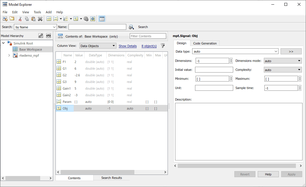В следующей таблице описаны свойства и значения свойств для mpt.Parameter и mpt.Signal объекты данных, отображаемые в обозревателе моделей.