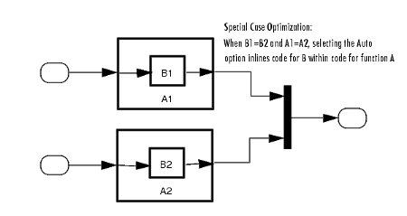 Параметр упаковки функции Auto опция может оптимизировать код в ситуациях, когда идентичные подсистемы содержат другие идентичные подсистемы, путем повторного использования и встраивания сгенерированного кода. Предположим, что модель, например, показанная в разделе Повторное использование идентичных вложенных подсистем, содержит идентичные подсистемы. A1 и A2. A1 содержит подсистему B1, и A2 содержит подсистему B2, которые идентичны. В таких случаях Auto вызывает создание одной функции, которая вызывается для обоих A1 и A2. Эта функция содержит одну часть встроенного кода для выполнения. B1 и B2. Эта оптимизация генерирует меньше кода, что повышает скорость выполнения.