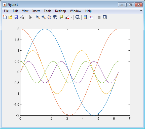 t=[0:0.01:2*pi]'; s1=[2*sin(t) 2*cos(t)]; s2=sin(2*t); s3=[0.5*sin(3*t) 0.5*cos(3*t)]; plot(t, [s1 s2 s3])