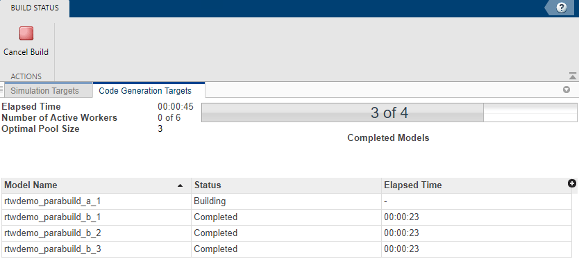 slbuild('rtwdemo_parabuild_a_1','OpenBuildStatusAutomatically',true)В окне Статус построения (Build Status) отображается общий ход построения и статус построения для моделей по мере работы генератора кода в иерархии моделей.