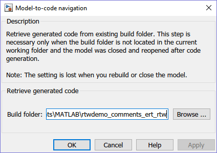 При закрытии и повторном открытии модели параметр контекстного меню «Перейти к коду» может быть недоступен, поскольку Embedded Coder ® не может найти папку сборки для модели в текущей рабочей папке. В этом случае выполните следующие шаги: