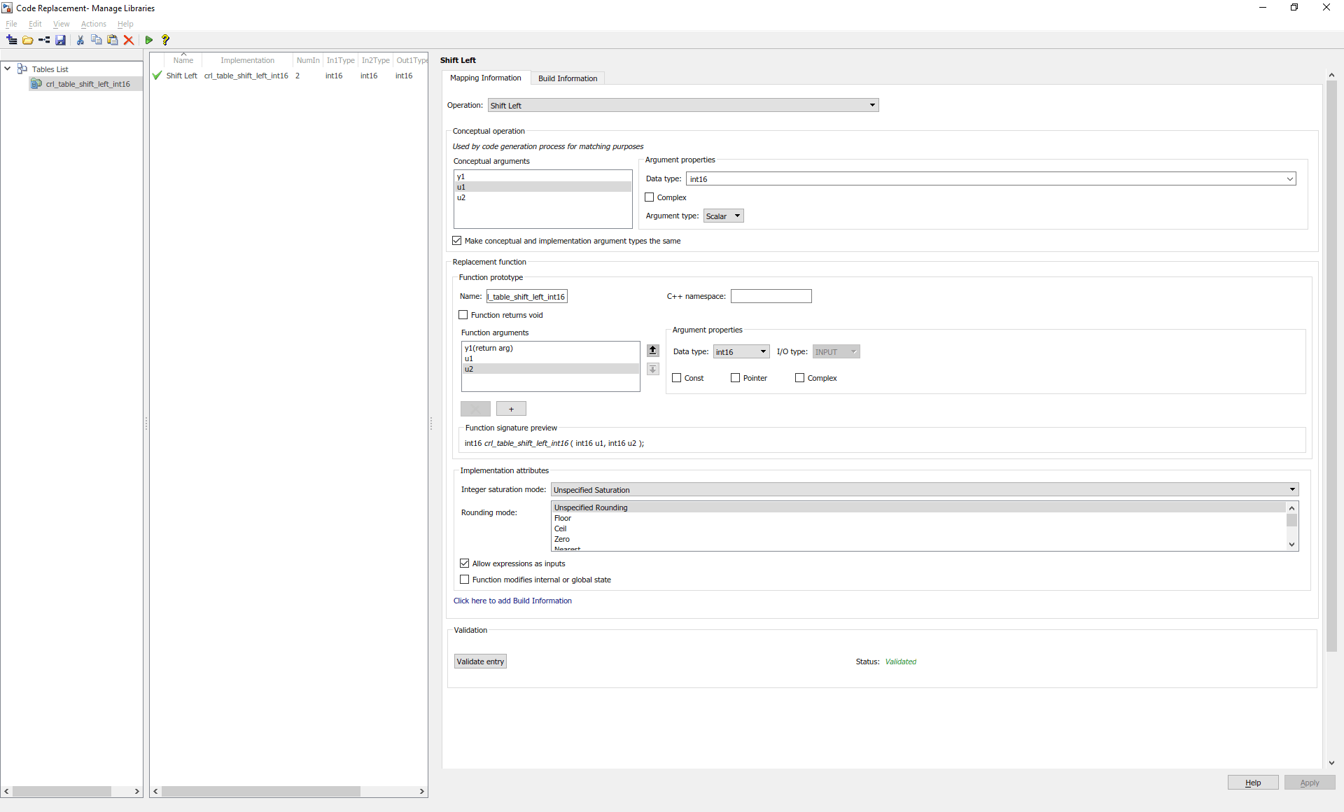 function hTable = crl_table_shift_left_int16() % Create a code replacement library table %% Create a table object hTable = RTW.TflTable; %% Create an entry hEntry = RTW.TflCOperationEntry; %% Create entry parameters setTflCOperationEntryParameters(hEntry, ... 'Key', 'RTW_OP_SL', ... 'Priority', 50, ... 'ImplementationName', 'my_shift_left', ... 'ImplementationHeaderFile', 'some_hdr.h', ... 'ImplementationSourceFile', 'some_hdr.c');