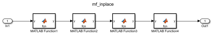 Для создания модели используйте функциональные блоки Inport, Outport и MATLAB mf_inplace.