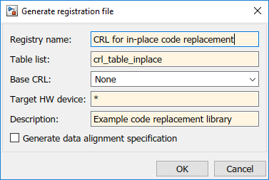 function rtwTargetInfo(cm) cm.registerTargetInfo(@loc_register_crl); end function this = loc_register_crl this(1) = RTW.TflRegistry; this(1).Name = 'CRL for inplace function replacement’; this(1).TableList = {'crl_table_inplace.m'}; % table created in this example this(1).TargetHWDeviceType = {'*'}; this(1).Description = 'Example code replacement library'; end