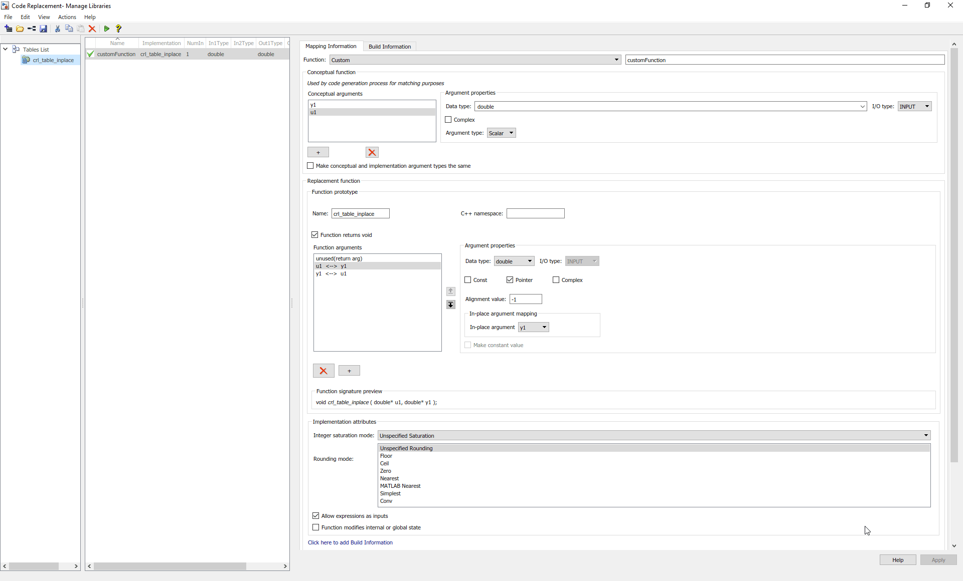 Создайте концептуальное представление. Концептуальное представление описывает подпись функции, которую требуется заменить. В подразделе Концептуальная функция crtool укажите возвращаемый аргумент y1 и входной аргумент u1 с двойным типом данных и типом аргумента указателя.