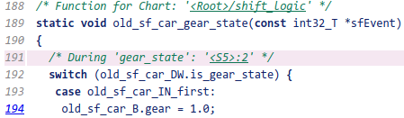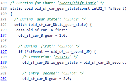 /* During 'gear_state': '<S5>:2' */Этот комментарий относится к during действие государства gear_state, которая имеет гиперссылку <S5>:2.
