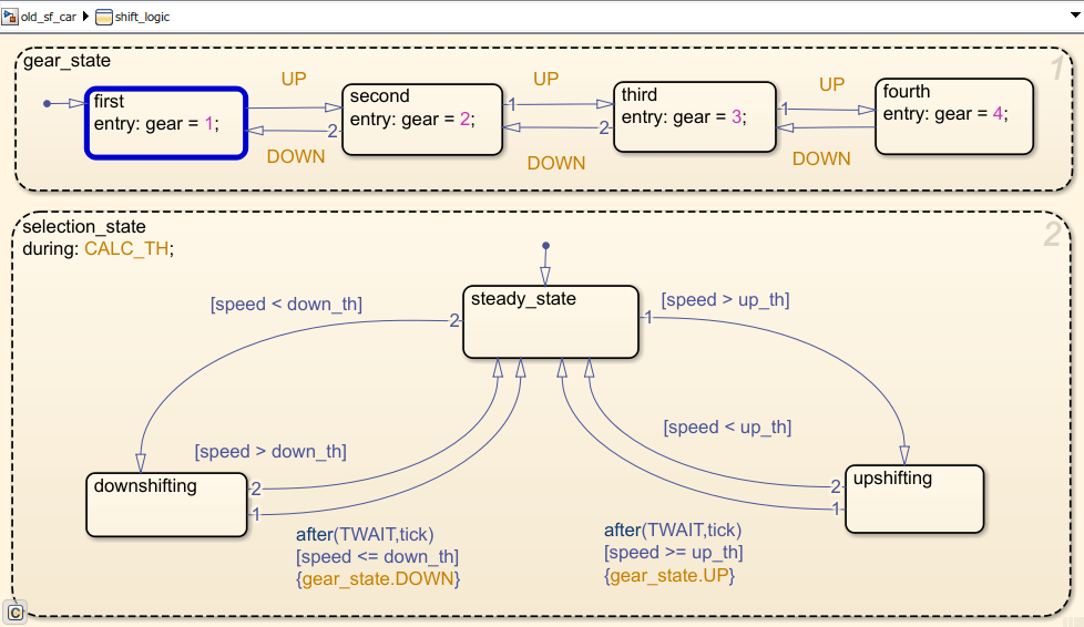 /* During 'gear_state': '<S5>:2' */Соответствующее состояние выделяется на диаграмме.