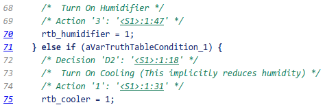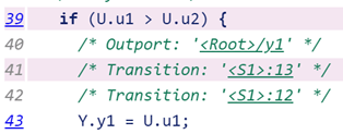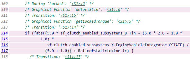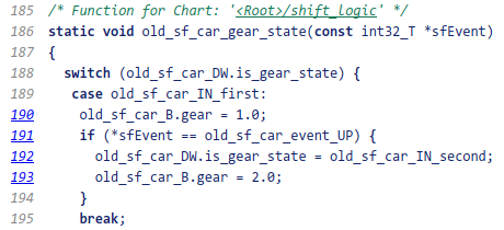 Код к модели: трассировка сгенерированного кода к модели путем щелчка гиперссылок в комментариях или номеров линий гиперссылок, что выделяет соответствующий элемент модели в редакторе Simulink Editor.