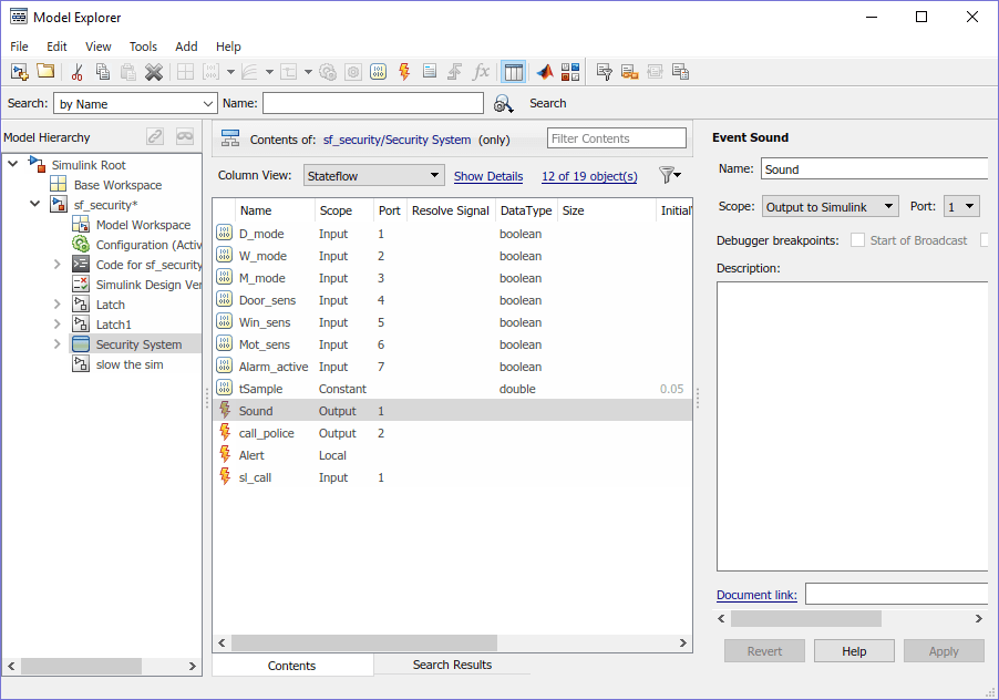 /* Event: '<S3>:56' */На панели Содержимое (Contents) Обозревателя моделей (Model Explorer) событие Sound отображается подсвеченным.