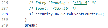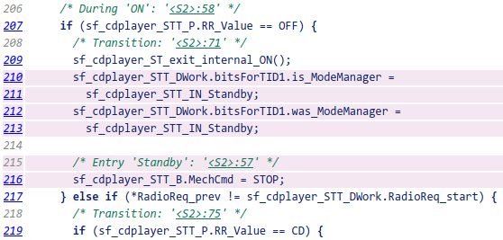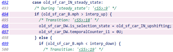 Встроенное отслеживание - это отслеживание на уровне строки, доступное в созданном коде. Можно щелкнуть гиперсвязанные номера линий для одновременной трассировки одного или нескольких элементов Stateflow.