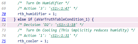 Можно также отследить условие, решение или действие в таблице по строке созданного кода. Например, щелкните правой кнопкой мыши ячейку в столбце D2 и выберите C/C + + Code > Перейти к C/C + + Code.