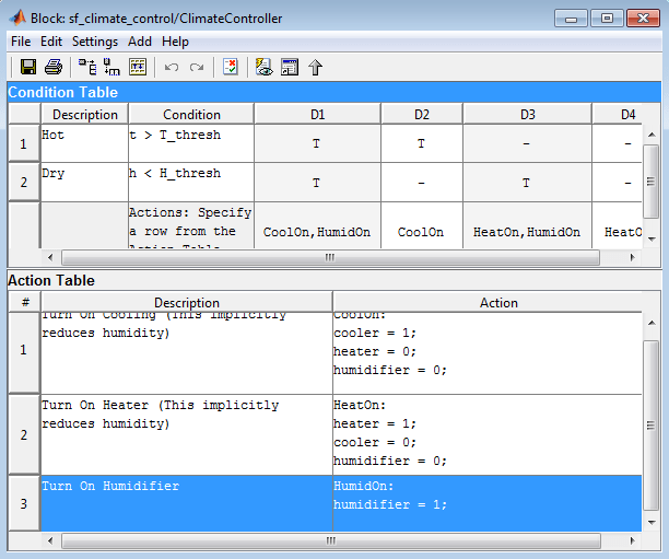 /* Action '3': '<S1>:1:47' */В редакторе таблиц истинности строка 3 таблицы действий отображается подсвеченной.