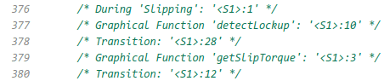 Можно отслеживать графическую функцию на диаграмме по строке сгенерированного кода. Например, щелкните правой кнопкой мыши графическую функцию. detectSlip и выберите C/C + + Code > Перейти к C/C + + Code.