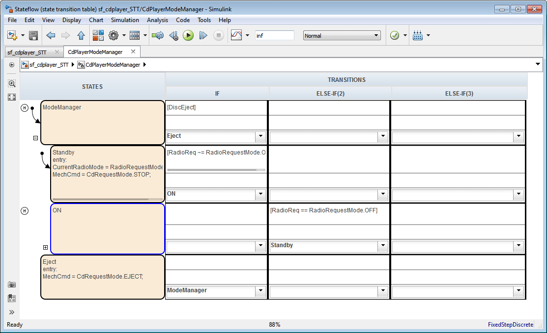 /* Entry Internal 'ON': '<S2>:58' */Соответствующее состояние'ON' отображается в таблице переходов состояний.