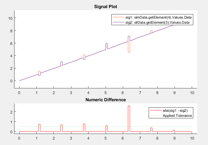 cgv.CGV.createToleranceFile('localtol', signalList, toleranceList);Сравните выходные сигналы данных. По умолчанию compare метод рассматривает все сигналы, которые имеют общее имя между обоими исполнениями. При наличии файла допуска cgv.CGV.compare использует связанный допуск для конкретного сигнала во время сравнения; в противном случае допуск равен нулю. В этом примере 'Plot' параметр имеет значение 'mismatch'. Поэтому только несовпадающие сигналы создают график.