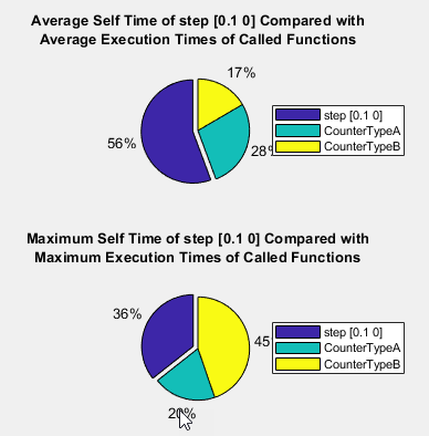Если созданный код для модели содержит вложенные функции, при моделировании создаются круговые диаграммы, показывающие относительное время выполнения вызывающей и вызываемой функций. Чтобы отобразить круговые диаграммы, щелкните значок