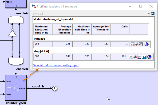 Из отчета профилирования выполнения кода можно отследить компонент модели, который создает набор метрик. Например, в столбце «Сечение» при нажатии кнопки CounterTypeA гиперссылка, Simulink Editor идентифицирует подсистему.