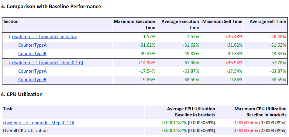 Можно создать отчет о профилировании выполнения кода, который сравнивает производительность созданного кода с производительностью ссылочной версии. Например, предположим, что необходимо использовать текущие метрики времени выполнения в executionProfile в качестве базовой линии для rtwdemo_sil_topmodel.
