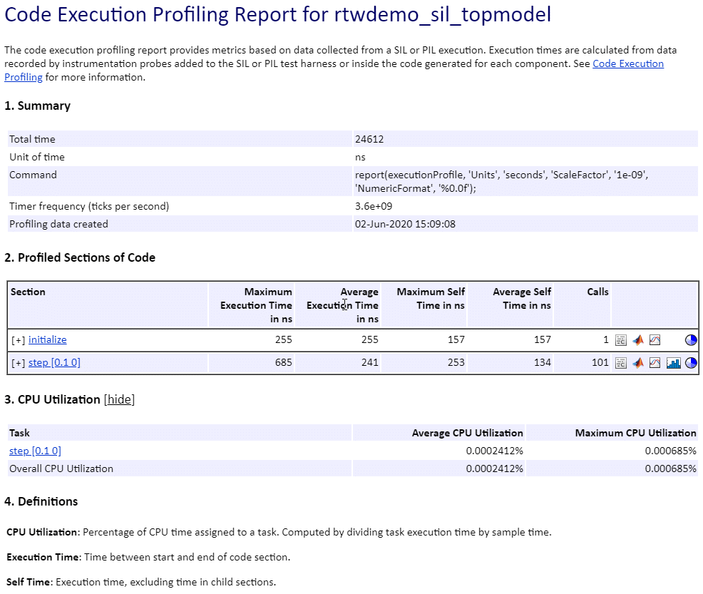 Вы запускаете моделирование программного обеспечения в цикле (SIL) или процессора в цикле (PIL), которое создает метрики времени выполнения для задач и функций в созданном коде. Во время моделирования можно использовать инспектор данных моделирования для наблюдения за временем выполнения потока. В конце моделирования можно выполнить следующие действия: