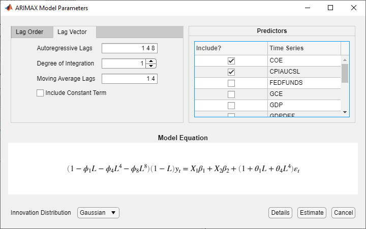 В приложении Econometric Modeler можно указать сезонную и несезонную структуру запаздывания, наличие константы, распределение инноваций и прогнозирующие переменные модели ARIMA (p, D, q) или SARIMA (p, D, q) × (ps, Ds, qs), выполнив эти шаги. Все указанные коэффициенты неизвестны, но поддаются оценке.