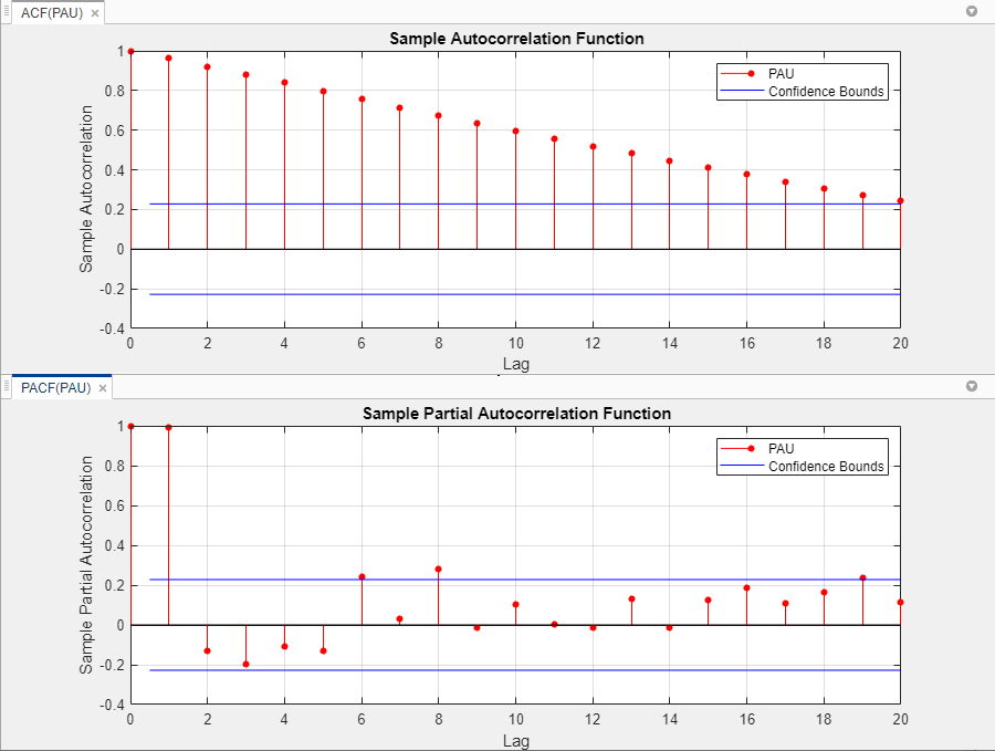Закройте все окна рисунков, за исключением коррелограмм. Затем перетащите окно фигуры ACF (PAU) над окном фигуры PACF (PAU).