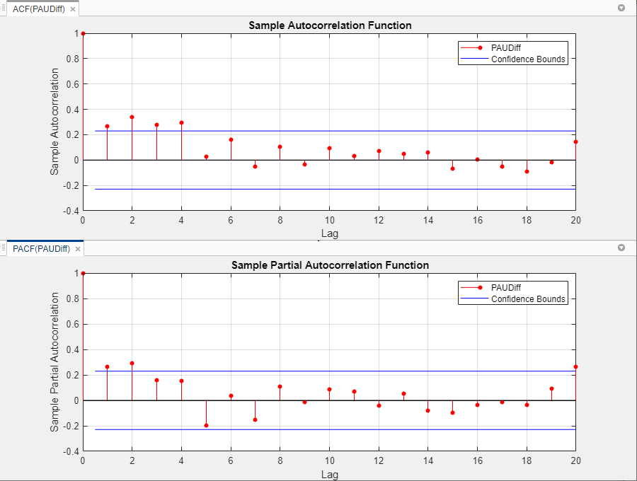 Закройте окно графика временных рядов (PAUDiff). Затем перетащите окно фигуры ACF (PAUDiff) над окном фигуры PACF (PAUDiff).