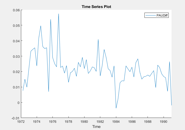 В этом примере показано, как использовать методологию Бокса-Дженкинса для выбора и оценки модели ARIMA с помощью приложения Econometric Modeler. Затем показано, как экспортировать предполагаемую модель для создания прогнозов. Набор данных, который хранится в Data_JAustralian.mat, содержит журнал квартальных австралийских индексов потребительских цен (ИПЦ), измеренных по 1972 и 1991, а также другие временные ряды.