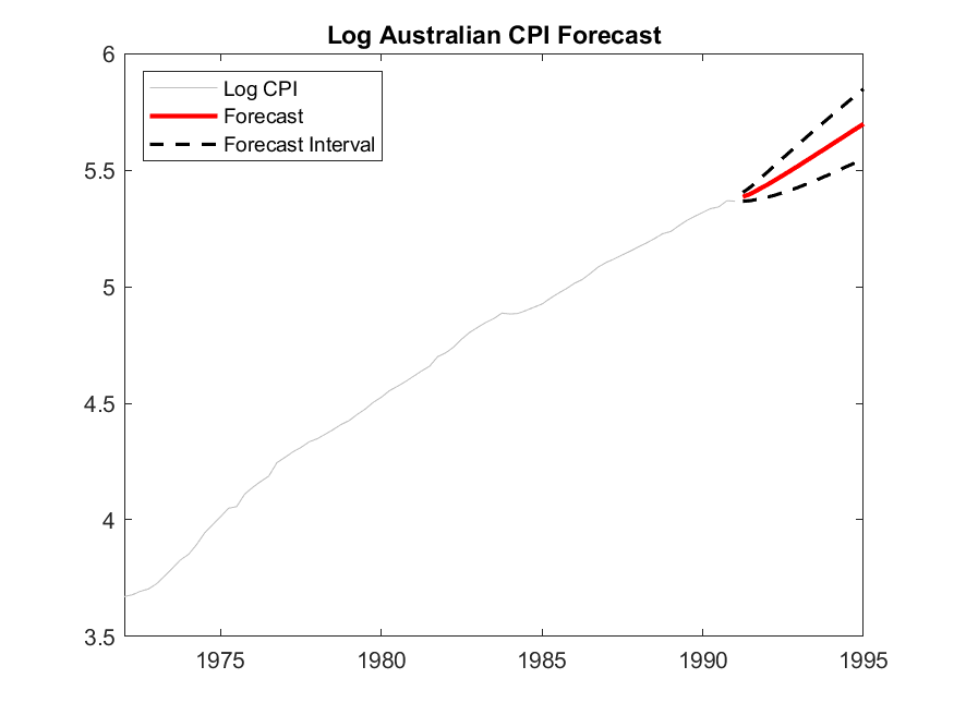 [PAUF,PAUMSE] = forecast(ARIMA_PAU,16,'Y0',PAU); UB = PAUF + 1.96*sqrt(PAUMSE); LB = PAUF - 1.96*sqrt(PAUMSE); datesF = dates(end) + calquarters(1:16); figure h4 = plot(dates,PAU,'Color',[.75,.75,.75]); hold on h5 = plot(datesF,PAUF,'r','LineWidth',2); h6 = plot(datesF,UB,'k--','LineWidth',1.5); plot(datesF,LB,'k--','LineWidth',1.5); legend([h4,h5,h6],'Log CPI','Forecast',... 'Forecast Interval','Location','Northwest') title('Log Australian CPI Forecast') hold off