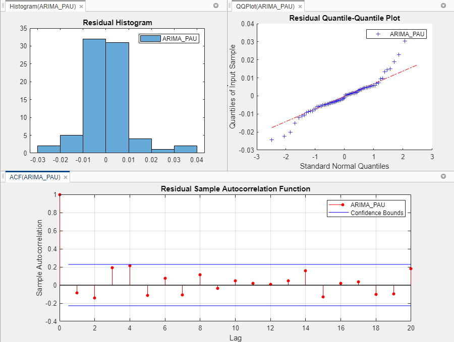 Проверьте, что остатки обычно распределены и не коррелированы, построив гистограмму, квантильный график и ACF остатков.
