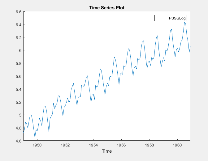 Серия демонстрирует сезонный тренд, последовательную корреляцию и возможный экспоненциальный рост. Интерактивный анализ последовательной корреляции см. в разделе Обнаружение последовательной корреляции с помощью приложения Econometric Modeler App.