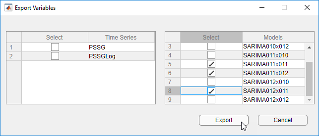 В диалоговом окне Экспорт переменных (Export Variables) в столбце Модели (Models) установите флажок Выбрать (Select) для SARIMA011x011, SARIMA011x012, и SARIMA012x011. Снимите флажок для любых других выбранных моделей.